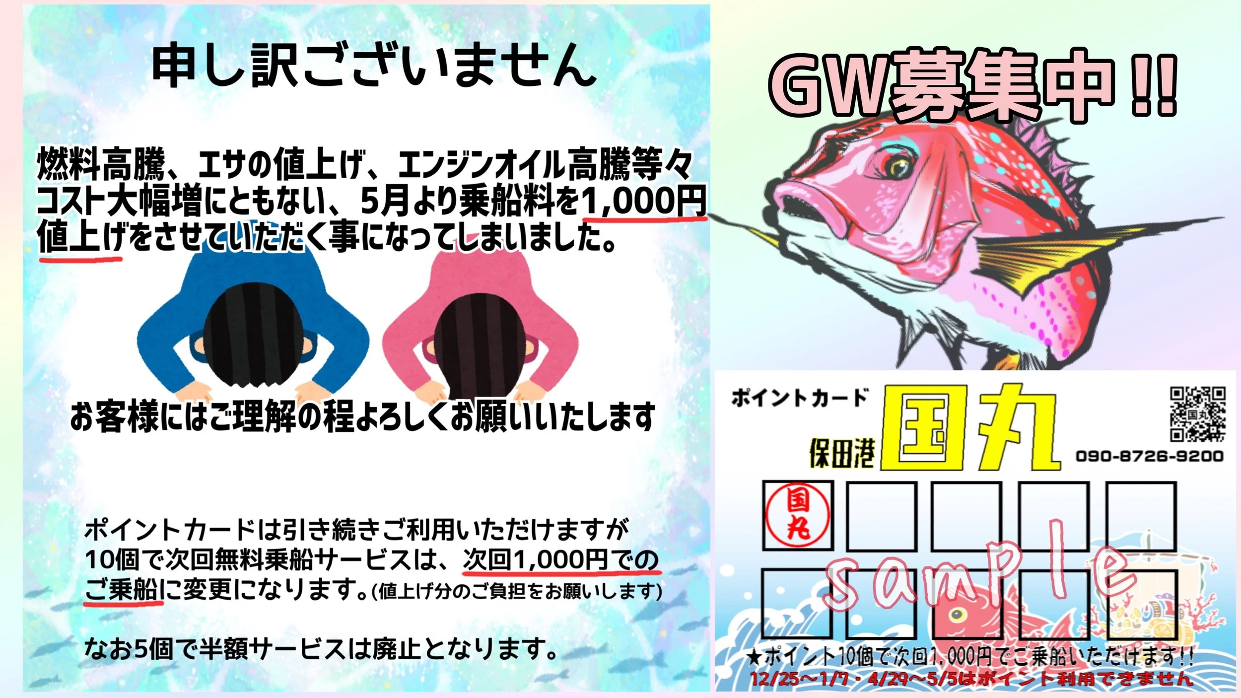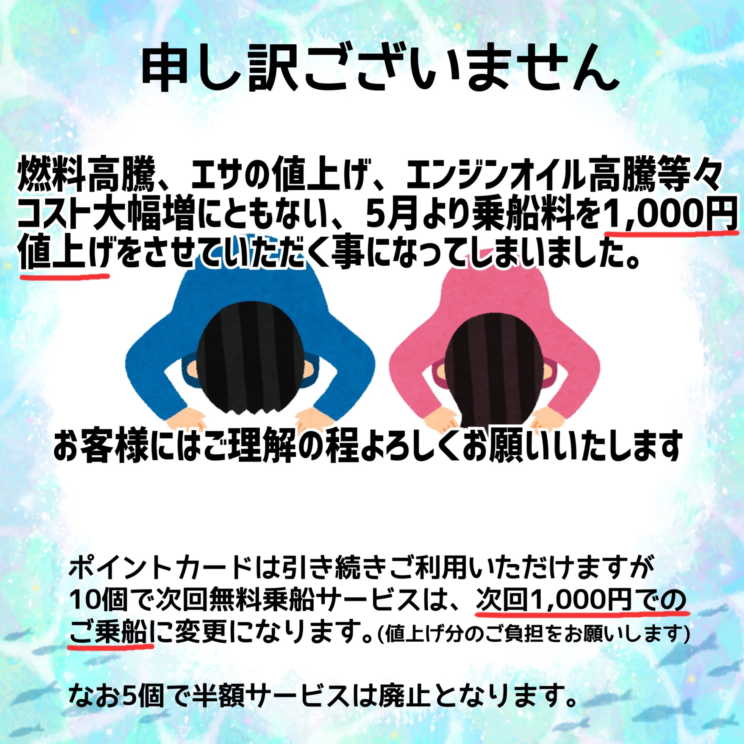 *中学生以下半額(予約時に必ずお伝えください)・付添いの中学生以下のお子様(竿出し無し)は乗船保険料として2,000円頂戴します。